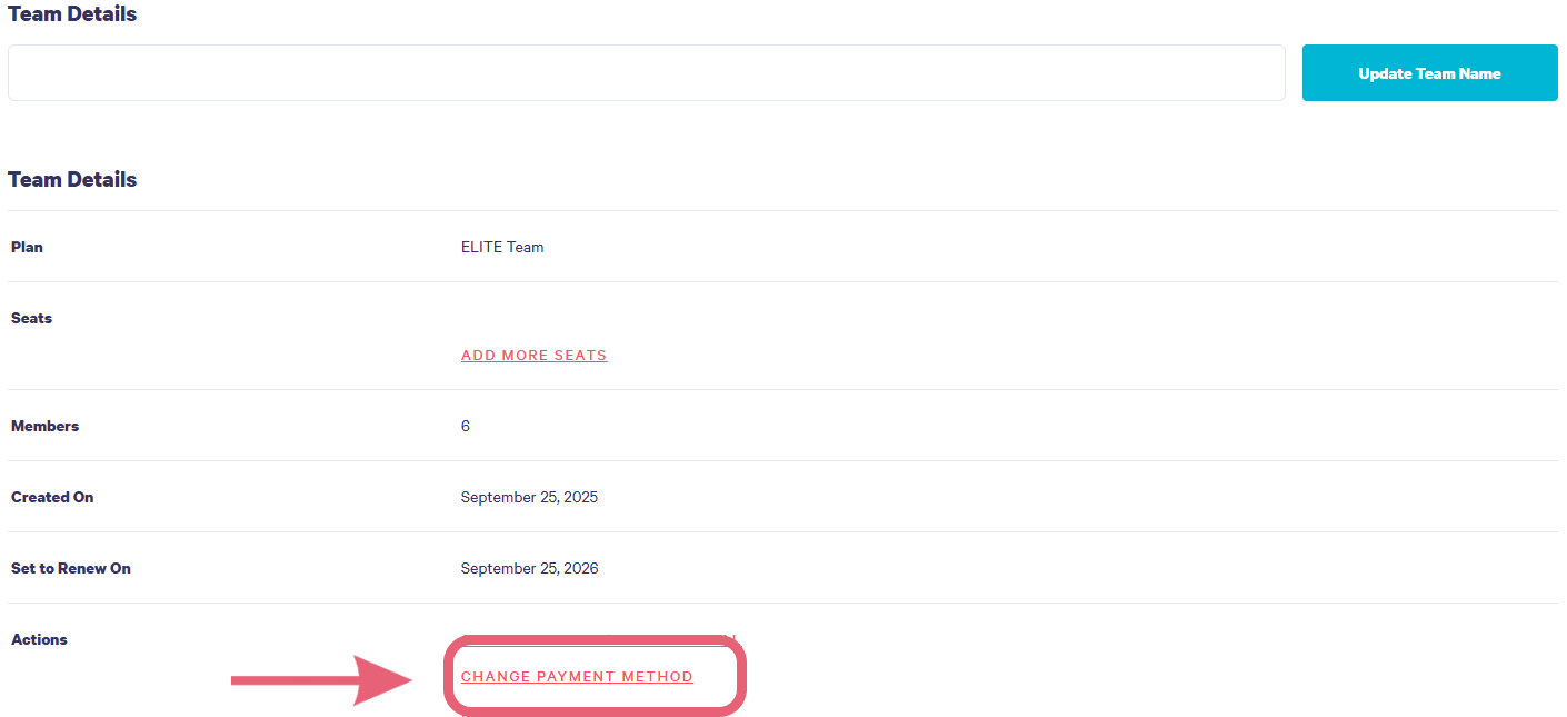 Click the Change Payment Method option located under the Team Details section.